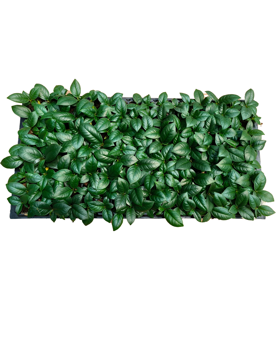 Broad green glossy leaves with oval shape and compact internodes.