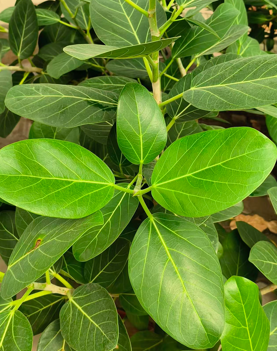 Ficus Audrey features emerald-green, oval leaves with prominent veins and a velvety texture. The leaves measure about 6-7cm wide on mature specimens. Another highlight is its sturdy, light-colored trunk that thickens with age. And compared to Ficus lyrata, Audrey is more forgiving whether planted outdoors or in a container, Ficus Audrey likes warm temperatures and slows down over the winter months and it can keep its leaves year-round.